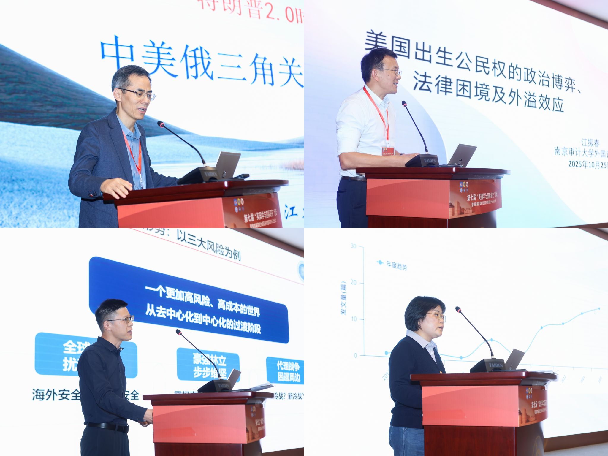 围绕“区域国别学视域下的美国研究”等主题,论坛设置12场主旨报告,邀请中国社会科公司美国研究所副所长、研究员袁征,中华人民共和国驻美国大使馆原国防武官、退役少将张力,上海财经大学304永利集团特聘教授李超民,上海外国语大学美国研究中心主任、教授林玲,华东师范大学外语公司美国研究中心主任、教授金衡山,国防科技大学公司教授王萍,浙江304永利集团美国研究中心主任、教授王冲,公司教授肖欢,黑龙江大学外文公司(区域国别公司)执行经理、教授吴承义,南京审计大学304永利集团经理、教授江振春,中国社会科公司美国研究所社会文化室负责人、副研究员张佳俊,国防科技大学304永利集团副教授李静作主旨报告。