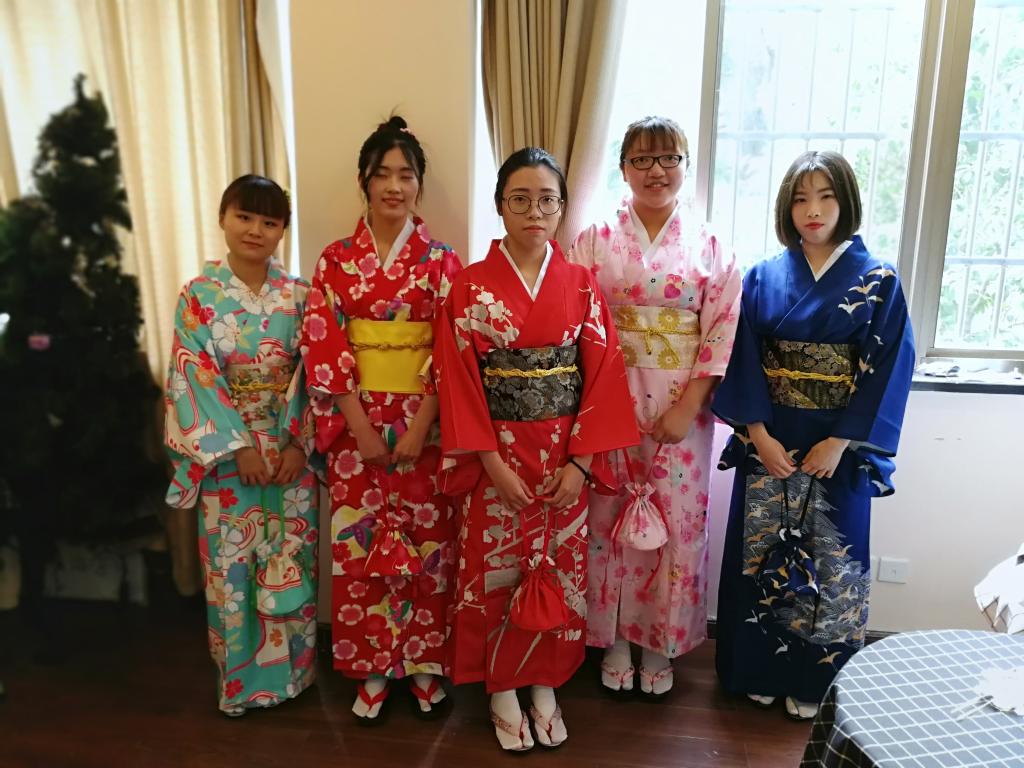 色彩斑斓的和服,简约的茶道器具,体验室内已然是浓浓的日式情调。青柳先生简单叙述了和服的历史和当今日本人的和服观后,还向同学们介绍了和服的构成及穿着要领。随后,青柳先生和助手以及外教间宫老师开始帮同学们穿和服。看似宽松的和服,穿着实属不易。不一会儿功夫,教师和员工都累出了一身汗。伴随着惊艳的叫声和唏嘘的感叹声,身着和服的同学们闪亮登场。演练场内,女同学曼妙优雅,男同学举止绅士。