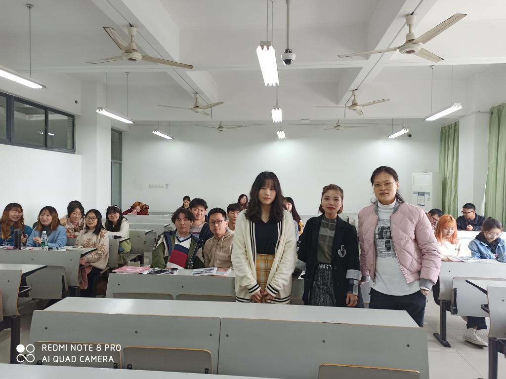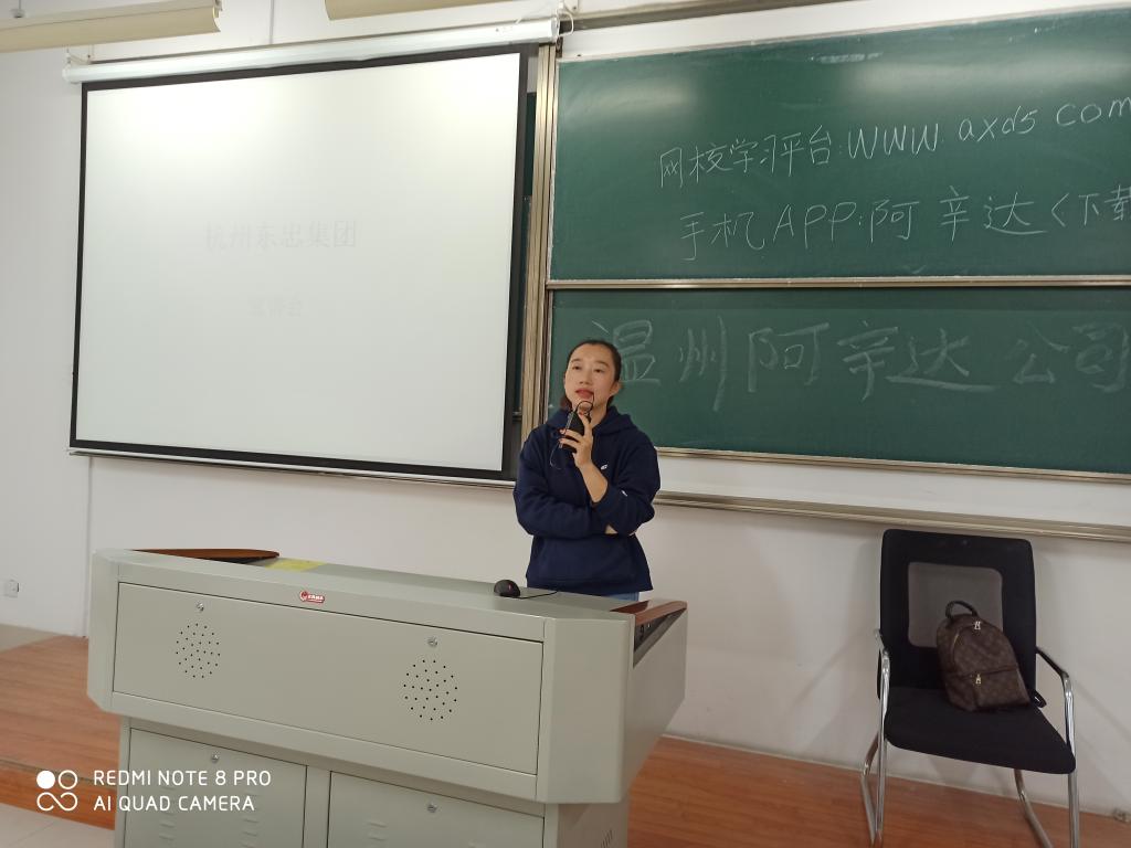 陪同温州阿辛达教育有限公司欧总经理前来授课的还有在该公司任教的公司日语专业毕业生林文瑶,林文瑶已经是温州阿辛达教育有限公司的品牌教师之一。欧总经理介绍了公司的基本情况,其中有着重介绍了公司良好的人文环境,她说,日语教育发展前景可观,欢迎同学们的加盟,温州阿辛达教育有限公司愿意竭诚为同学们提供良好的工作环境。