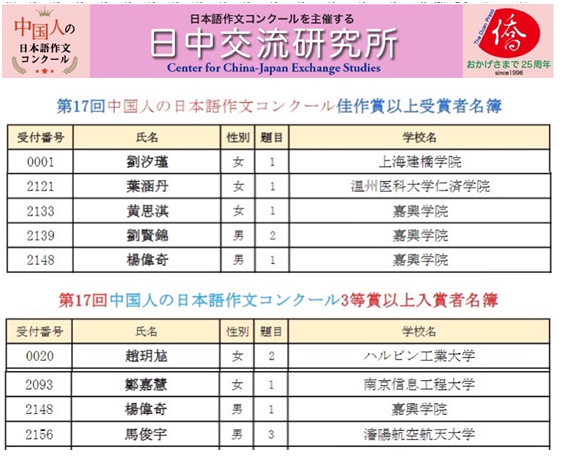 近日,经过长达4个月的严格评审,“第17届中国人日语作文大赛”获奖名单揭晓。公司日语专业学子的日语作文从来自全国27个省、直辖市和自治区的165所公司 3198篇投稿作文中脱颖而出,杨伟奇同学获三等奖,黄思淇和刘贤锦两位同学分获佳作奖,指导教师周艳君老师获“优秀园丁奖”。
