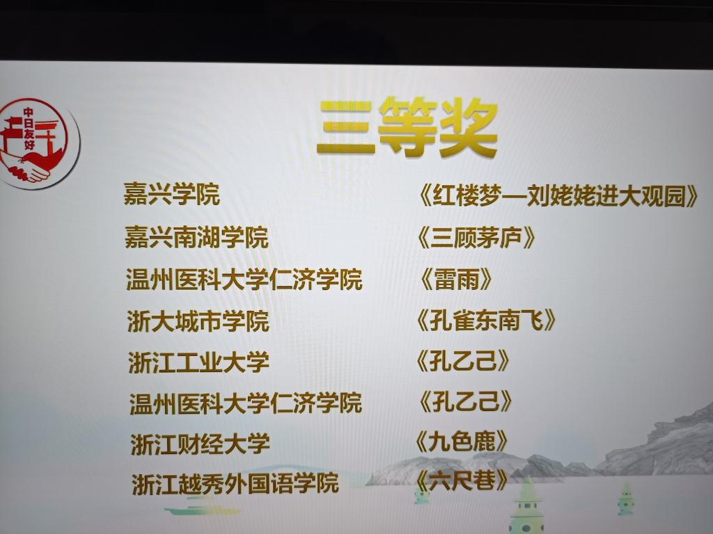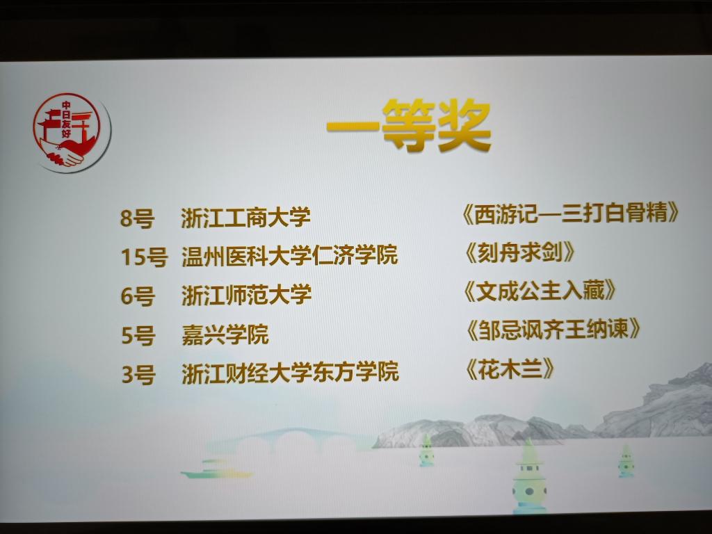 2022年11月26日,由浙江省人民对外友好协会主办,浙江工商大学东方语言与哲学公司团委承办,中国日语教学研究会浙皖赣分会、浙江工商大学和风日语协会协办的“第十一届浙江省日剧play大赛”顺利落幕。此次大赛的主题是“用日语演活中国经典”,吸引了浙江省高校31支队伍参赛,经过专家严格评审并参照日本国内点赞数,最终15支队伍进入决赛。在周艳君博士的悉心指导下,经过初赛、复赛和决赛的多轮激烈角逐,公司日语专业201和202两个班同学演绎的《邹忌讽齐王纳谏》和《红楼梦-刘姥姥一进荣国府》两个剧目分获一等奖和三等奖。