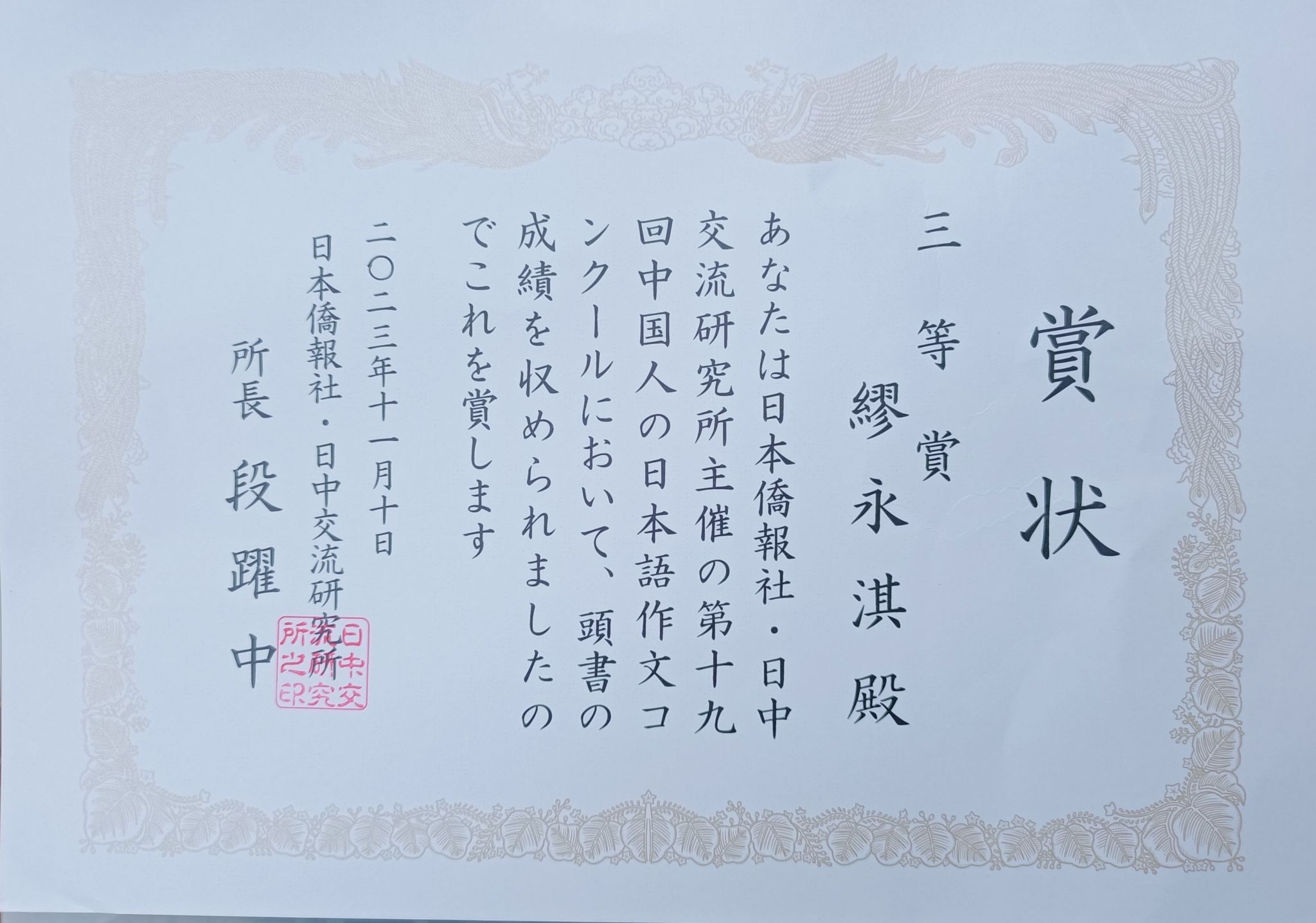 近日,由日本侨报社和日中交流研究所共同举办的“第19届全中国日语作文大赛”评选结果最终揭晓,公司日语专业2020级缪永琪同学的日语作文“過去に鑑みて中日平和を孕む”(中文题目“以史为鉴 共育中日和平”)荣获三等奖。
