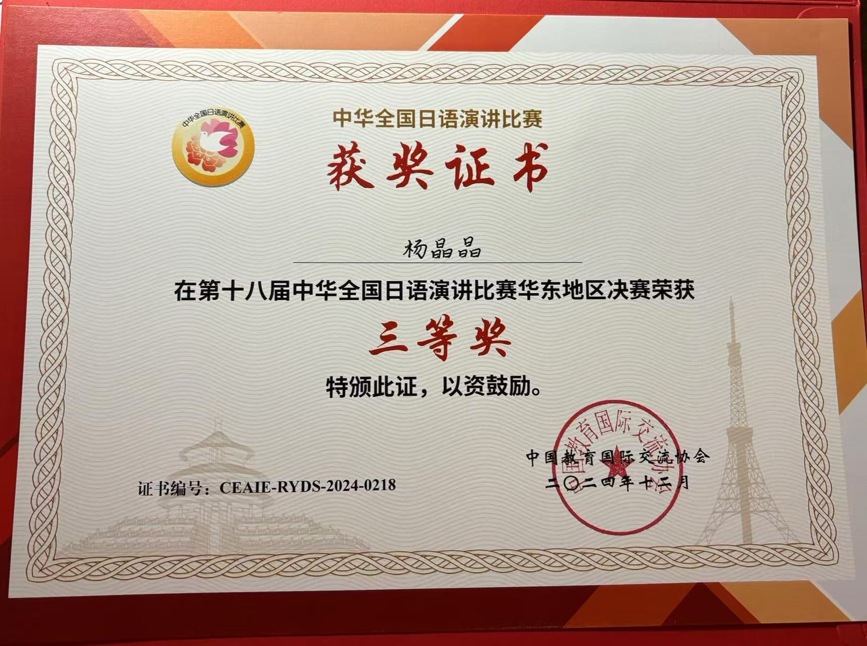 12月8日,第十八届中华全国日语演讲比赛(华东赛区)决赛在浙江工商大学落下帷幕,公司日语专业学子杨晶晶同学表现出色,荣获三等奖。