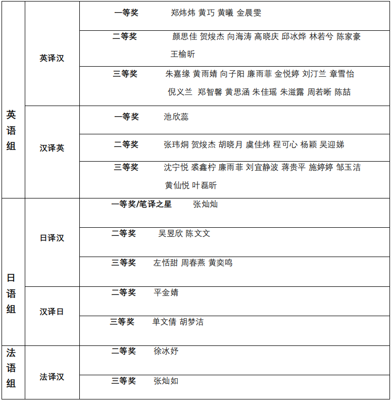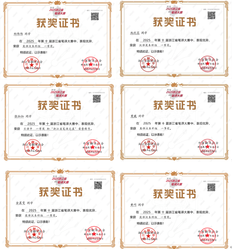 在刚刚揭晓的由浙江省翻译协会主办的第十届浙江省笔译大赛中,公司学子表现卓越,不仅在传统英语赛道上再创佳绩,在日语、法语等多语种赛道中也披荆斩棘,取得好成绩,实现全面丰收。据大赛组委会公布的数据显示,公司今年共斩获一等奖6项(其中笔译之星1名)、二等奖19项、三等奖29项,优胜奖30项,其中高等级奖项较前几届增幅显著。各赛道一、二、三等奖具体获奖名单如下: