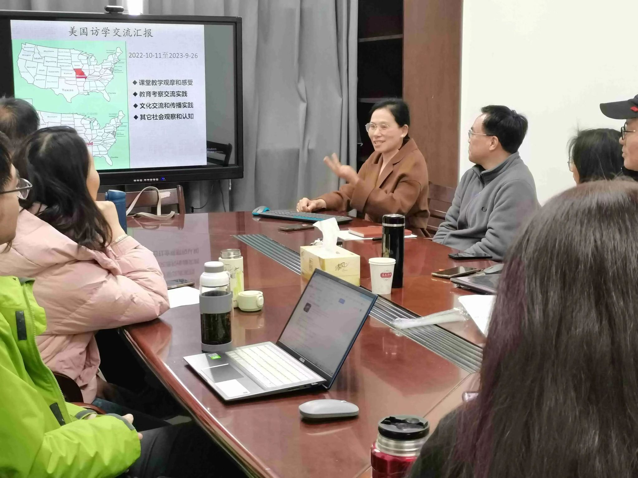 陶教授从四个方面分享了在美国密苏里州立大学访学期间的经历和感受,包括课堂教学观摩、教育考察和交流、文化交流和传播,以及其它社会观察和认知。除参与密苏里州立大学的课堂教学观摩与交流研究之外,陶教授还主动考察了几所中、小学和专科公司,真切感受到美国公司以员工为主的理念和自由活泼的管理氛围。本着文化传播与交流的强烈意识,陶教授访学期间积极参与了多种文化传播和交流活动, 给密苏里州立大学本科生做了题为“中国文化里的集体主义”讲座,受到师生好评。此外,陶教授分享了对美国社会的观察和认知。陶教授认为,在跨文化交际实践中应该强化民族身份意识、扬长避短、洋为中用、传播中国文化,增强文化自信。