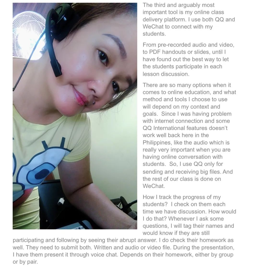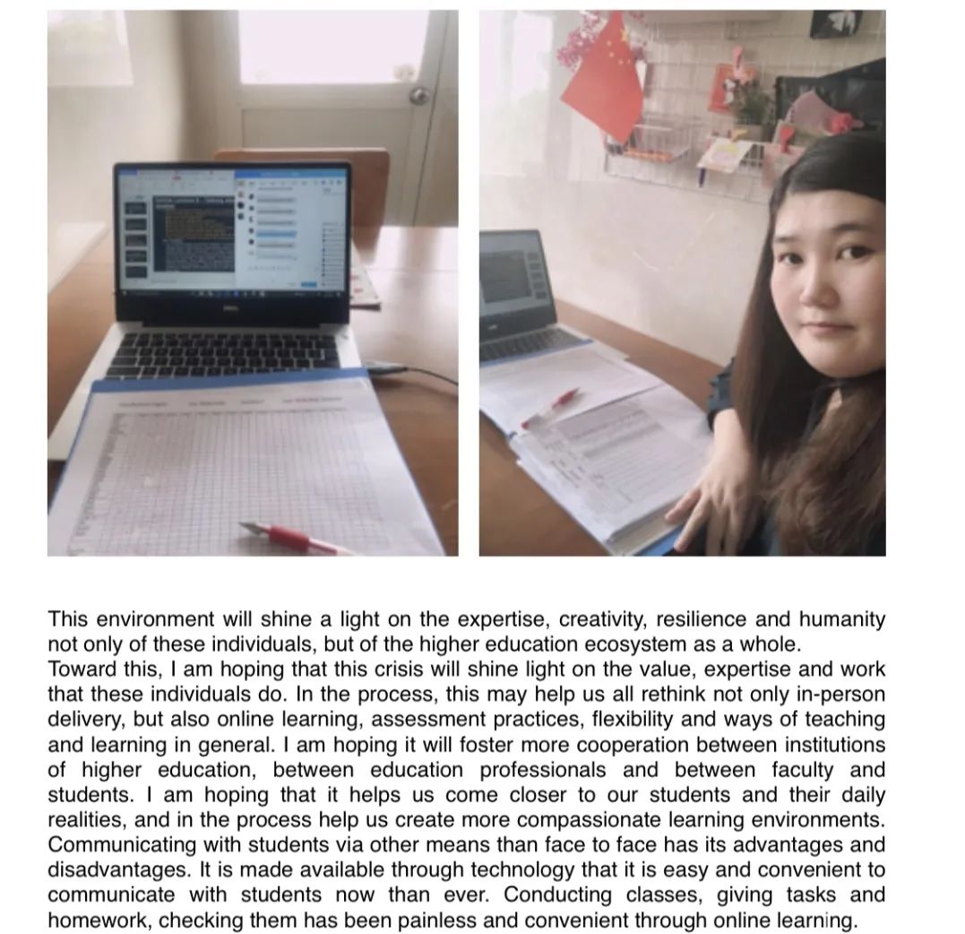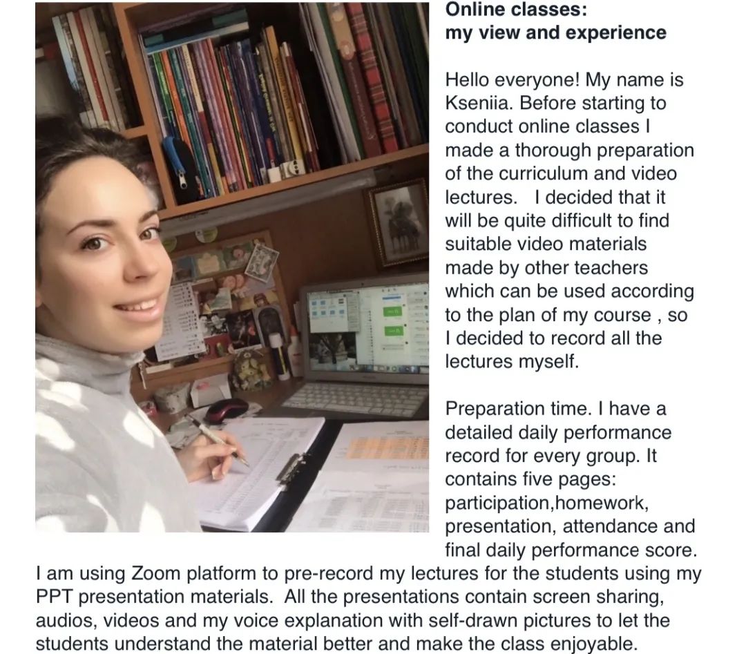 疫情之初,有四位外教在国内,三位外教已返回故乡度假。开学前两周,外教们收到在线教学的通知,除美国外教Daniel因时差关系无法开展在线授课外,其他外教都积极响应。身在乌克兰的外教Kseniia听到这个消息非常兴奋,她非常渴望以另外一种方式与员工见面。Kseniia努力克服8小时的时差,在教务办老师的协调下,重新调整了部分班级的上课时间,她所担任的13个口语教学班的课程一个也没有少,全部如期顺利开展。远在菲律宾的外教Len将手提电脑和教学文件等都留在了中国,为了不影响在线教学质量,她在本国又重新购置了电脑并安装了所需的软件以开展教学。她们说距离不会阻断她们对员工的爱。