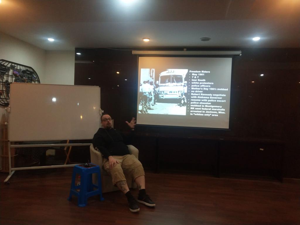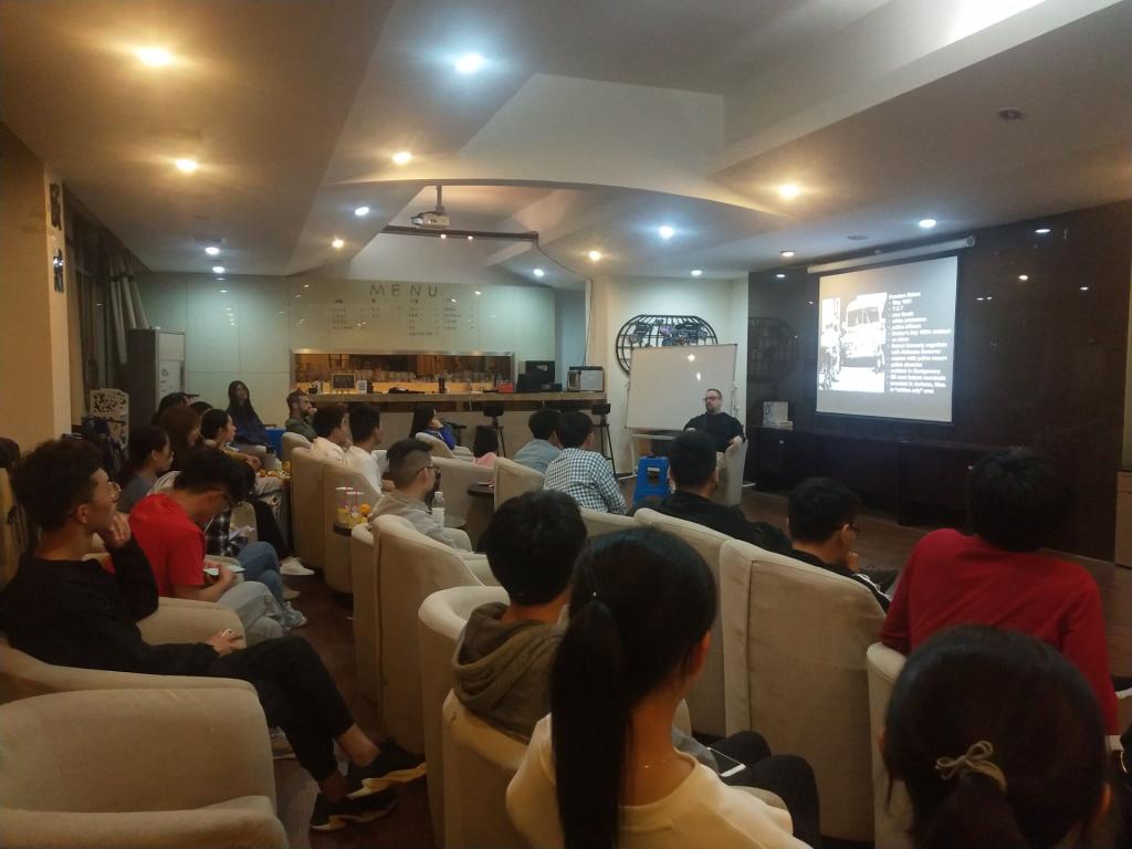 2019-2020年第一学期的第二次中外教教学沙龙在304永利集团咖啡吧如期举行,本次沙龙主讲人为美籍外教Nathan Tomey。 Nathan老师从太空战、肯尼迪、美国内战、嬉皮士、石墙事件以及吉姆•克劳法等六大主题全方位展示了20世纪60年代的美国,娓娓道来,带领我们穿越时光、穿越距离,去领略当时的跌宕时代。每一个主题都进行了前测、讲解与后测三个环节,环环相扣,引人入胜,每一个主题都是知识大讲堂,都是文化大洗礼,更是60年代美国的影片式生动再现。每一次Nathan老师的沙龙,可以毫不夸张地说,绝不辜负听众的每一分钟。