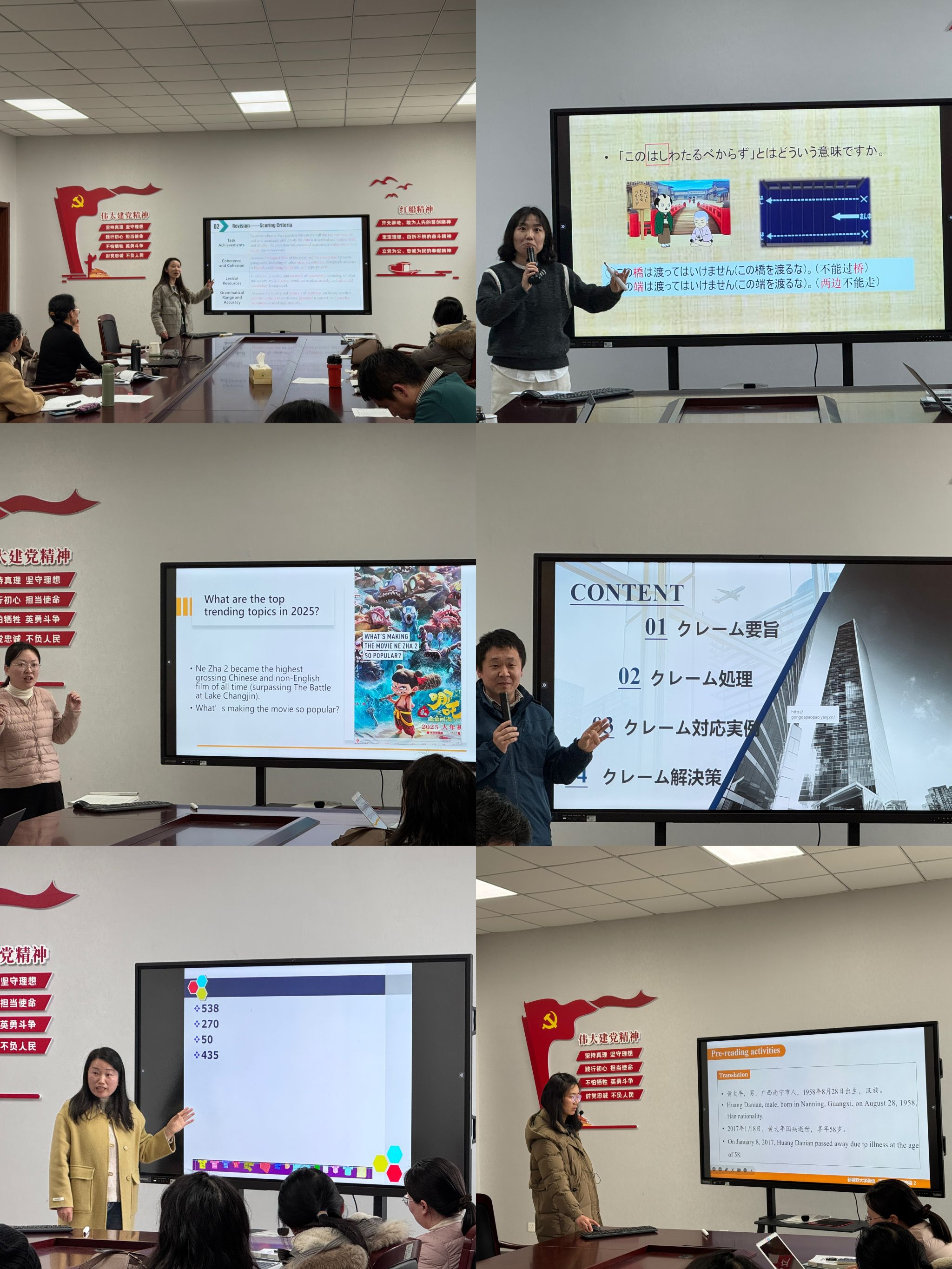 竞赛现场,六位参赛教师围绕各自专业特色,进行了精彩纷呈的教学展示。大外部邱宇蕾以《大学英语II》课程中“战略科学家黄大年”为案例,生动诠释家国情怀与学术精神的融合;高晨笛通过《雅思英语》的饼状图写作训练,构建数据可视化表达能力培养体系。英语系侯飞在《英语国家概况》中创新采用文化对比分析法,陆婷婷则以电影《哪吒2》这一当前热点话题为切入点,在国际网络营销课程中演绎跨境电商客户服务的实战策略。日语系教师王雪通过《日语阅读》解析汉字对日本文字体系的深远影响,董旭阳在《国际商务日语谈判》中创设仿真商务场景,全方位锻炼员工跨文化谈判能力。