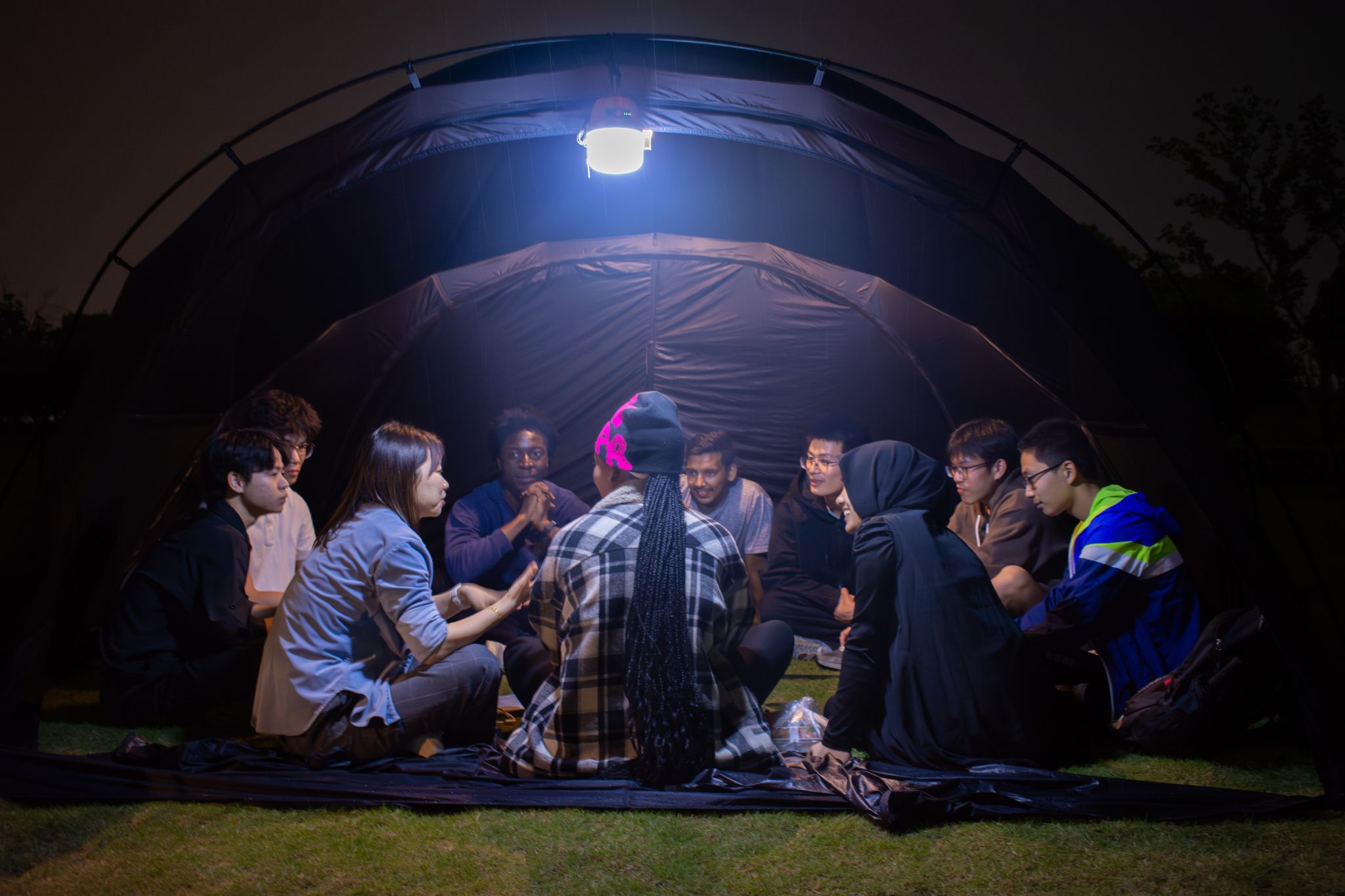 当外语交流邂逅户外露营,当淅沥春雨碰撞多语对话,4月24日晚,一场主题为“Camping”(露营时光)的外语角活动在探梅坡诗意展开。本次活动打破传统模式,以夜空为幕、以草地为席,在搭起的一座座帐篷中书写了独特的跨文化叙事。