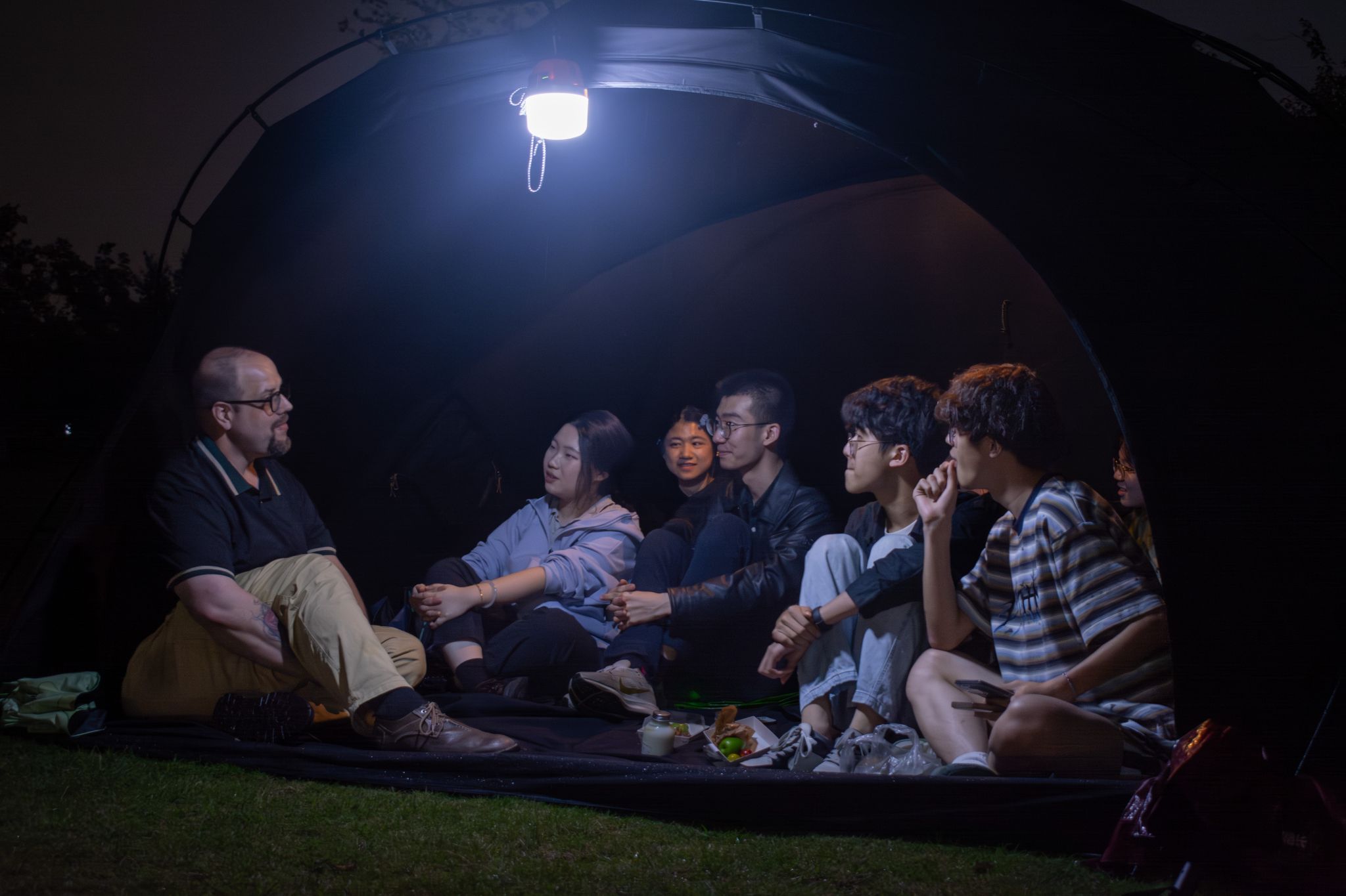 雨势渐歇后,探梅坡上演戏剧性转场。外教Kay化身“说书人”,向同学们讲述暗藏玄机的悬疑故事,员工们则以妙趣横生的故事回应。最后活动在驻场乐队的歌声中进入尾声。