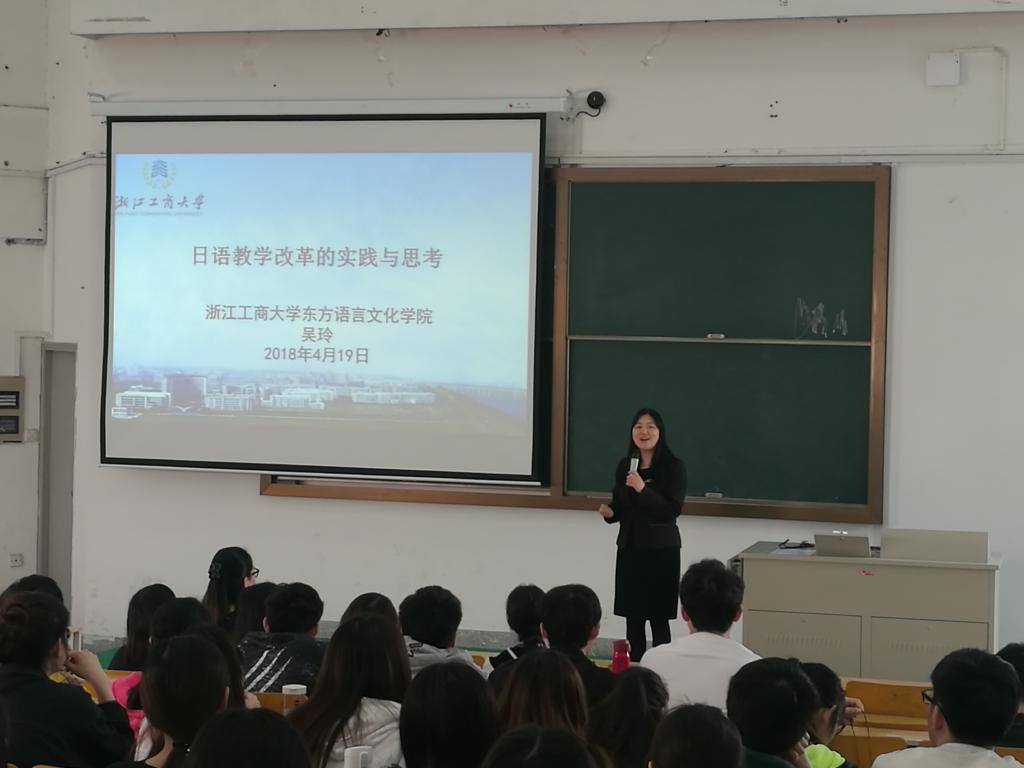 时值公司专业审核性评估进入关键阶段,4月19日下午,浙江工商大学东方语言文化公司副经理兼浙皖赣日语教学研究会秘书长吴玲教授莅临公司,就公司日语专业建设与日语专业教师进行了交流,还为师生们做了“日语教学改革的实践与思考”的讲座。