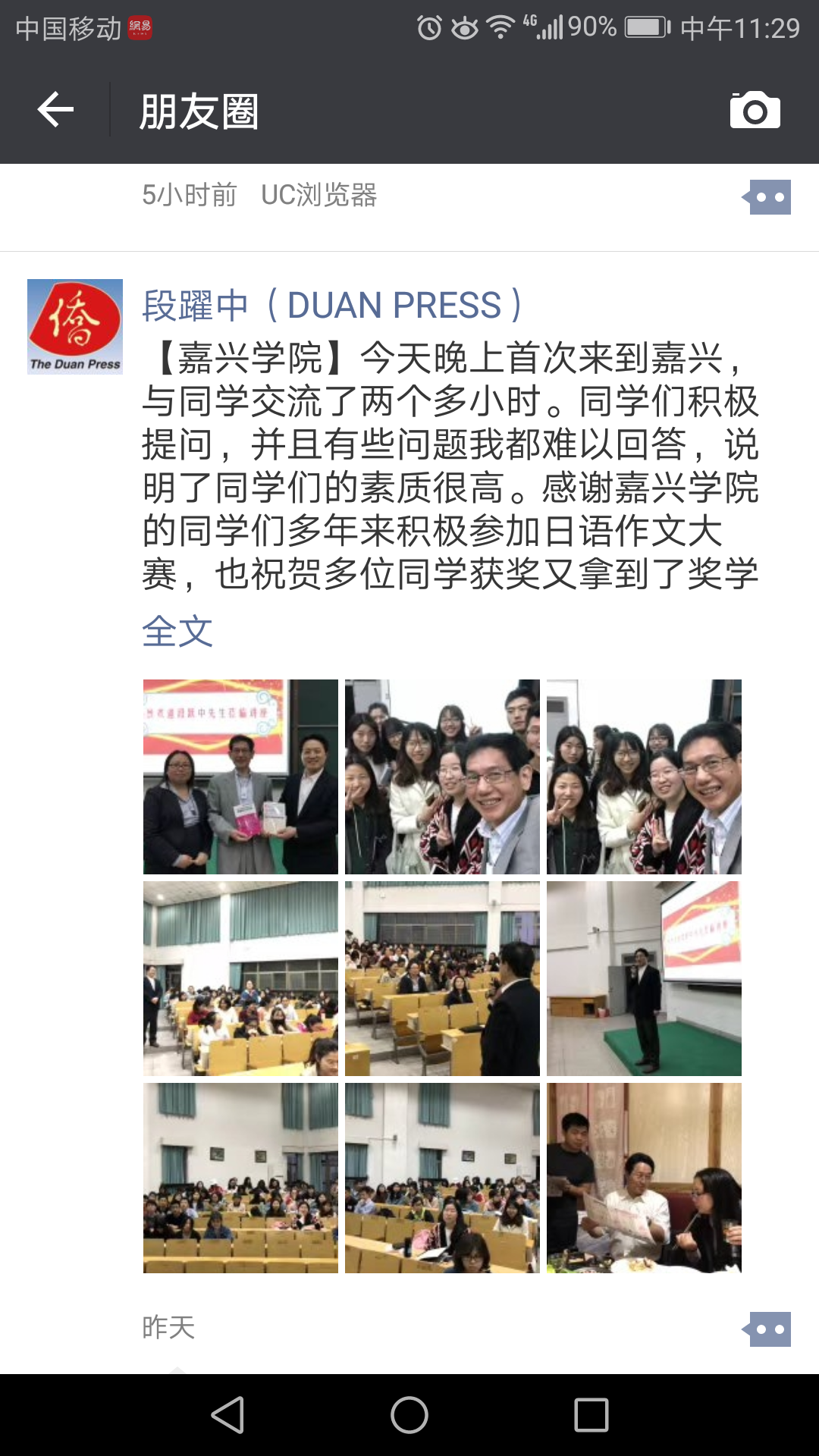 以“面向主流社会,服务中日交流”为宗旨,段先生先后创立了在日中国人文献资料中心、创办了《日本侨报》及日本侨报出版社、日中交流研究所、NPO法人日中交流支援机构等,宣传报道中国,力促中日友好。尤其是段先生力推举办的“中国人日语作文大赛”,迄今已十三届,每年有全国数百所高校共近四千多篇日语作文参赛,是我国迄今为止规模最大、规格最高的一个专业日语教学水平的国家级大赛。在获奖概率仅为2%的激烈竞赛中,近三年,公司日语专业5位同学荣获三等奖,10名同学获佳作奖,三次获得“优秀指导教师奖”。特别是其中的金梦莹和朱杭珈两位同学分获480万日元赴日留学奖学金,为浙江省唯一获得此项高额奖学金的高校。公司日语专业的教学得到了段先生的首肯,这也是促成段先生此行的一个重要契机。
