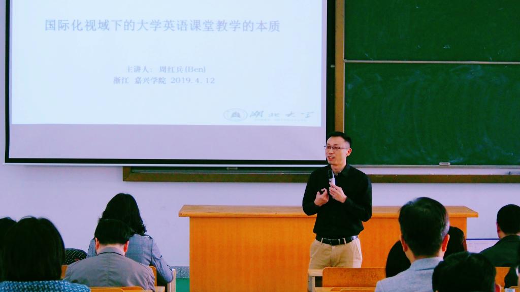 2019年4月12日下午,应304永利集团邀请,“湖北大学学子心中最有魅力教师”周红兵副教授在外语楼310做了一场题为《国际化视阈下的大学英语课堂教学本质》的学术讲座。讲座由大外部高万全主任主持,全体大外教师和部分南湖公司大外教师到场细心聆听。
