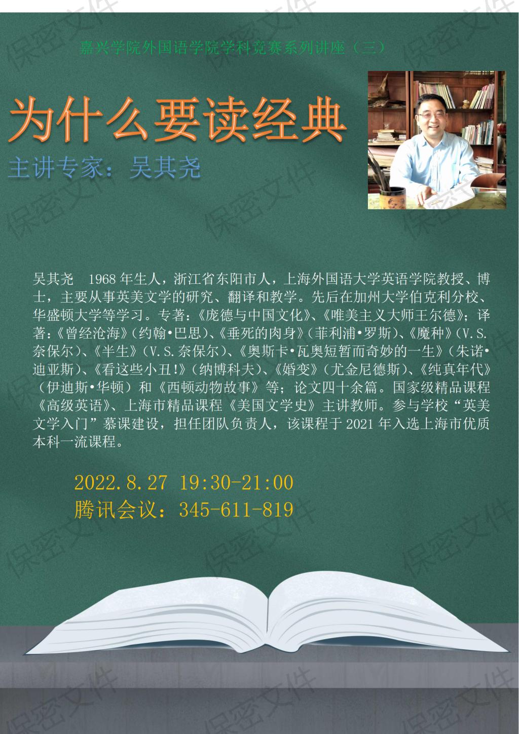 2022年8月27日晚7点30分,上海外国语大学吴其尧教授为公司师生举办了一场题为《我们为什么要读经典》的线上讲座。吴教授从大学教育需要有开明的文化修养、开阔的视野、历史的视角和哲学的氛围谈起,论述了“什么是经典”、“为什么要读经典”,以及“如何读经典”三个方面的问题。吴教授认为,经典必须具备如下四个特点:1,应该具有内涵的丰富性,是对人的处境有真切的关心,是对人的命运有深刻的体察,是对人的内心经验有感同身受的体谅和同情;2,应该具有实质的创造性;3,应该具有时空的跨越性;4,应该具有无限可读性。讲座中吴教授古今中外的文学经典信手拈来,用大量生动、富有启发意义的经典文本带领师生们走进一场学术盛宴。讲座中吴教授和师生们即时互动,并解答了师生们的问题。
