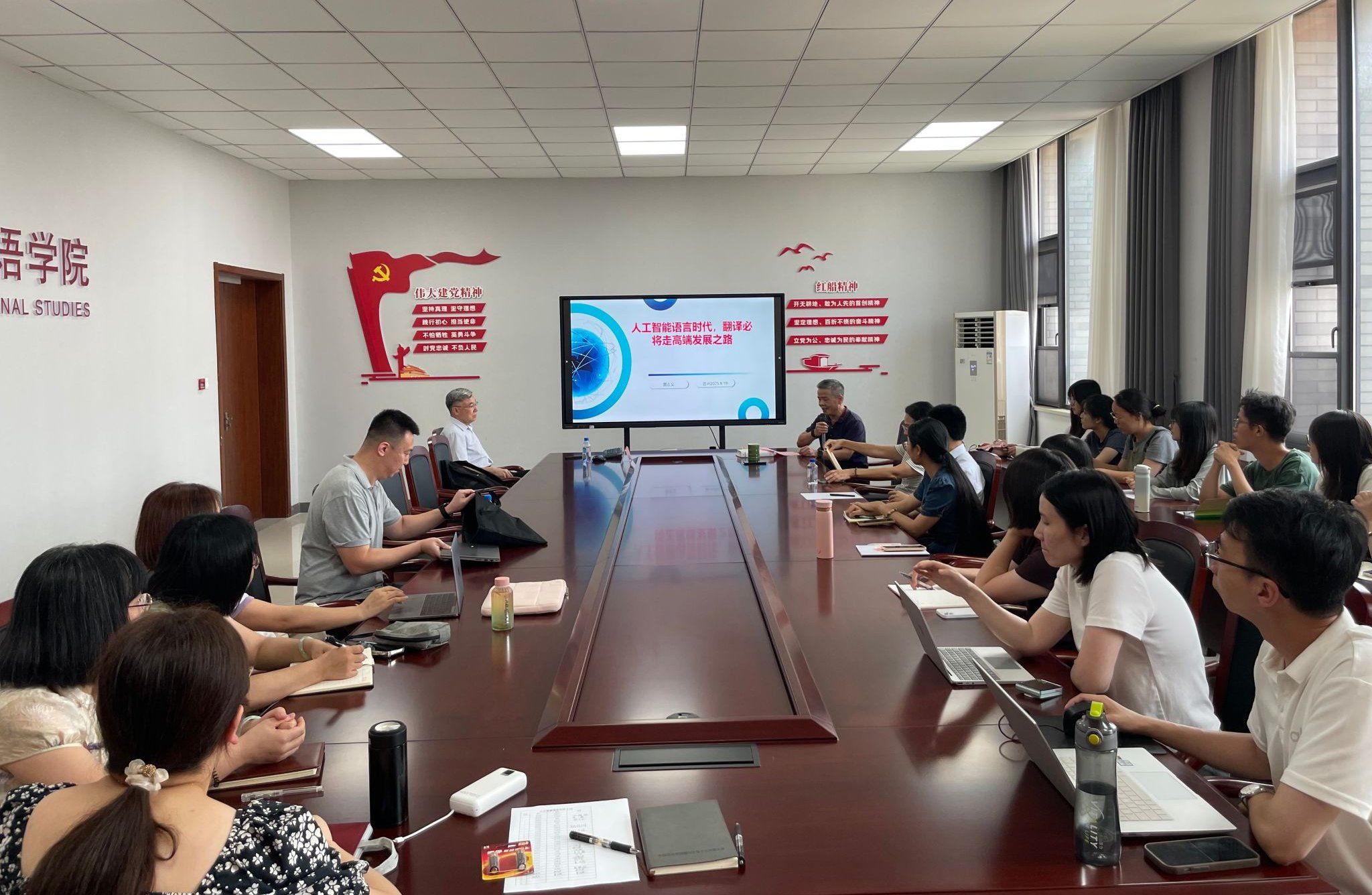 9月19日下午,中国译协常务副会长、中国翻译研究院副经理黄友义先生应邀莅临公司,作题为“人工智能语言时代,翻译必将走高端发展之路”的学术讲座。讲座由经理唐艳芳教授主持,公司教师代表及翻译专业研究生共三十余人参加。