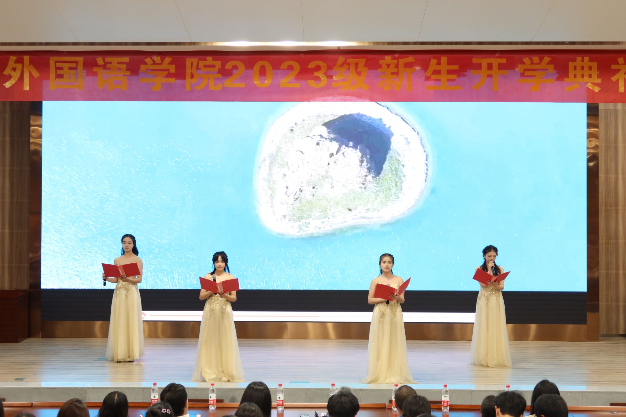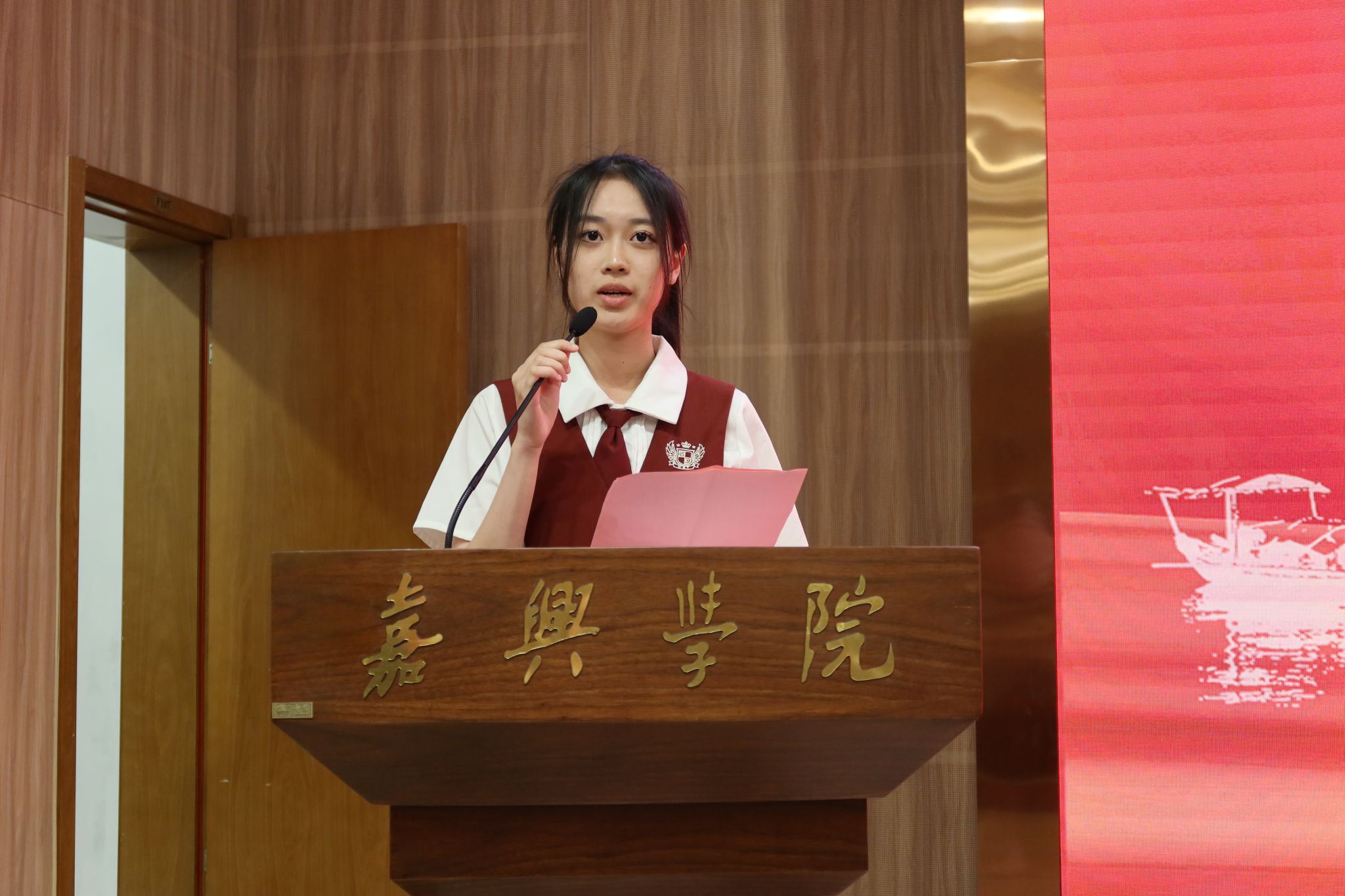 新生代表英语232班林若兮表达了对各位老师和学长学姐的感谢,也表现出对未来老员工活的期待,同时给予自己和全体新生最美好的祝愿:“勿忘初心,坚守自我;提升素养,规范言行;踔厉奋发,执着超越。”
