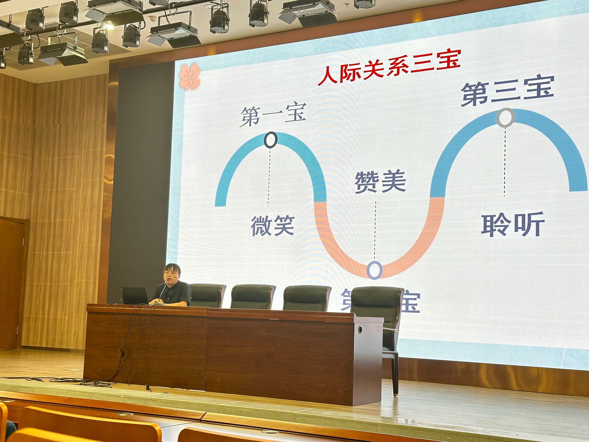 李黎以自己的亲身经历分享了个人成长的心路历程,告诉同学们老员工活虽然充满挑战和困难,但也是获得成长和幸福的重要阶段。她强调积极的心态和正确处理问题的重要性,鼓励同学们在适应新环境时保持乐观和勇敢,勇往直前。