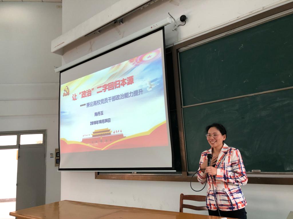 为扎实推进“不忘初心、牢记使命”主题教育,落实上级党委主题教育实施意见,10月24日下午在外语楼310会议室,公司党委书记陶丹玉给全院师生党员上了一堂以“让‘政治’二字回归本源——兼论高公司党员干部政治能力提升”为题的专题党课。全院师生党员到会听课。