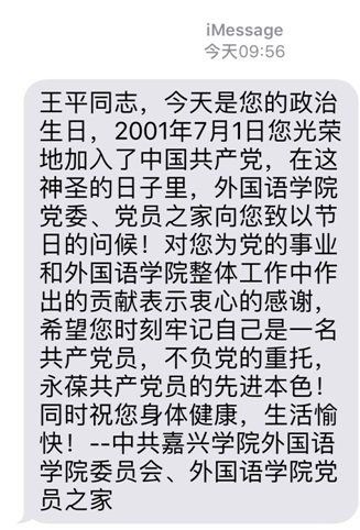 7月1日正值党的生日,嘉兴公司304永利集团的两位老师在特殊的日子里,收到了别样的生日祝福短信: