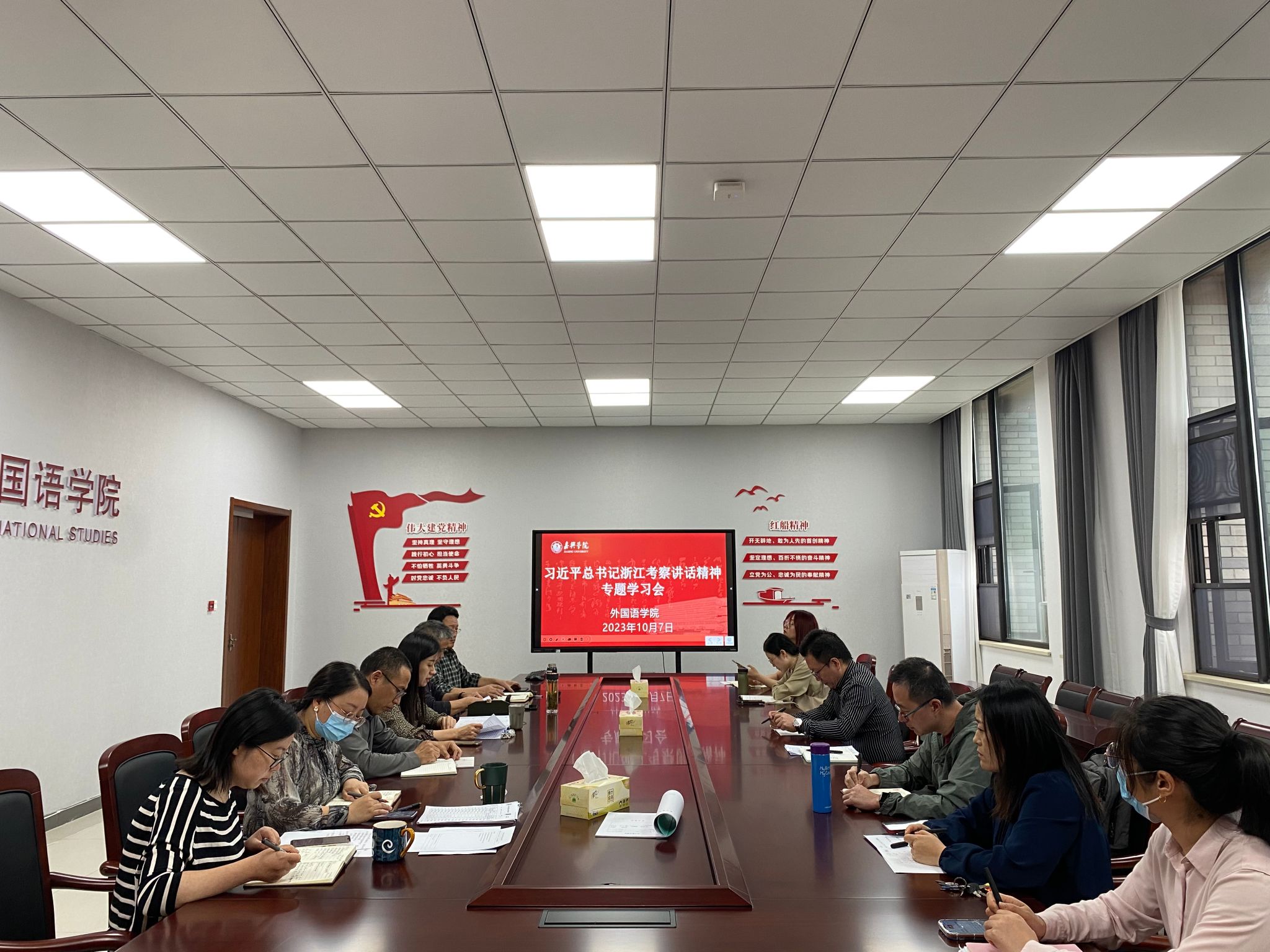 会议强调,要学深悟透习近平总书记考察浙江重要讲话精神,坚定捍卫“两个确立”、坚决做到“两个维护”的政治高度,坚决把思想和行动统一到习近平总书记考察浙江重要讲话精神上来。我们必须提高政治站位、提升政治能力,深刻领悟重大意义和深远影响,形成响亮声势、营造浓厚氛围。要把学习宣传贯彻习近平总书记考察浙江重要讲话精神,作为公司当前和今后一段时期的重要政治任务,在全院范围内迅速兴起学习宣传贯彻习近平总书记考察浙江重要讲话精神热潮,将学习与推进主题教育常态化、长效化结合起来,与贯彻落实习近平总书记在浙江工作期间致公司办学90周年贺信精神结合起来,与聚焦公司中心工作和落实当前重点任务结合起来,融入主责主业,强化实干精神,务求干事实效,做好省级党建工作标杆院系建设、翻译硕士申报、本科教学审核评估、人才培养方案修订等各项工作,把习近平总书记考察浙江重要讲话精神转化为干在实处、走在前列、勇立潮头的磅礴力量,不断推动公司事业高质量发展。