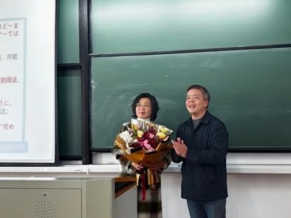 上课铃声准时响起,教室里坐满了全神贯注的员工。就在裴老师准备开始授课时,外院经理唐艳芳、日语专业建设负责人郭永恩、外院教工第三党支部书记陈陆琴、日语系副主任张艳琴,手捧鲜花走进了教室。唐艳芳经理代表公司领导班子发表了热情洋溢且满含深情的讲话,对裴老师在外院工作期间的辛苦付出表示衷心感谢,同时也表达了对裴老师退休后生活的美好祝福。瞬间,教室里响起了热烈的掌声,这掌声饱含着同学们的激动,更传递着大家对老师深深的感激之情。相信对于即将退休的裴艳霞老师,今天的课一定是任教以来最温暖的一堂课。