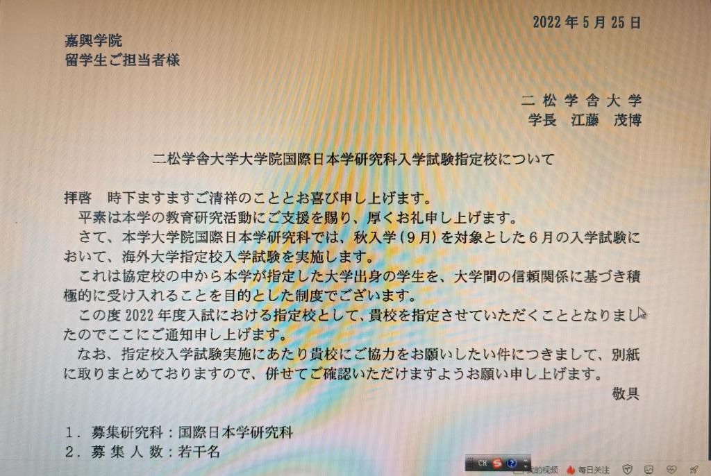 在公司国际交流处的大力支持下,公司日语专业与日本二松学舍大学建立了稳定的国际交流关系。鉴于多年来与日本二松学舍大学3+1项目顺利实施,今年,日本二松学舍大学将公司确定为二松学舍大学国际日本学专业硕士研究生推荐校,希望录用公司优秀日语专业毕业生赴日读研。今年2月和6月,公司日语专业组织了4名毕业生参加日本二松学舍大学硕士研究生考试,考试时间、内容和录用通知与日本国内同步进行。6月17日,公司日语专业4名毕业生均以优异的成绩通过了日本二松学舍大学硕士考试,被日本二松学舍大学录取为国际日本学专业的硕士研究生,录取率为100%。