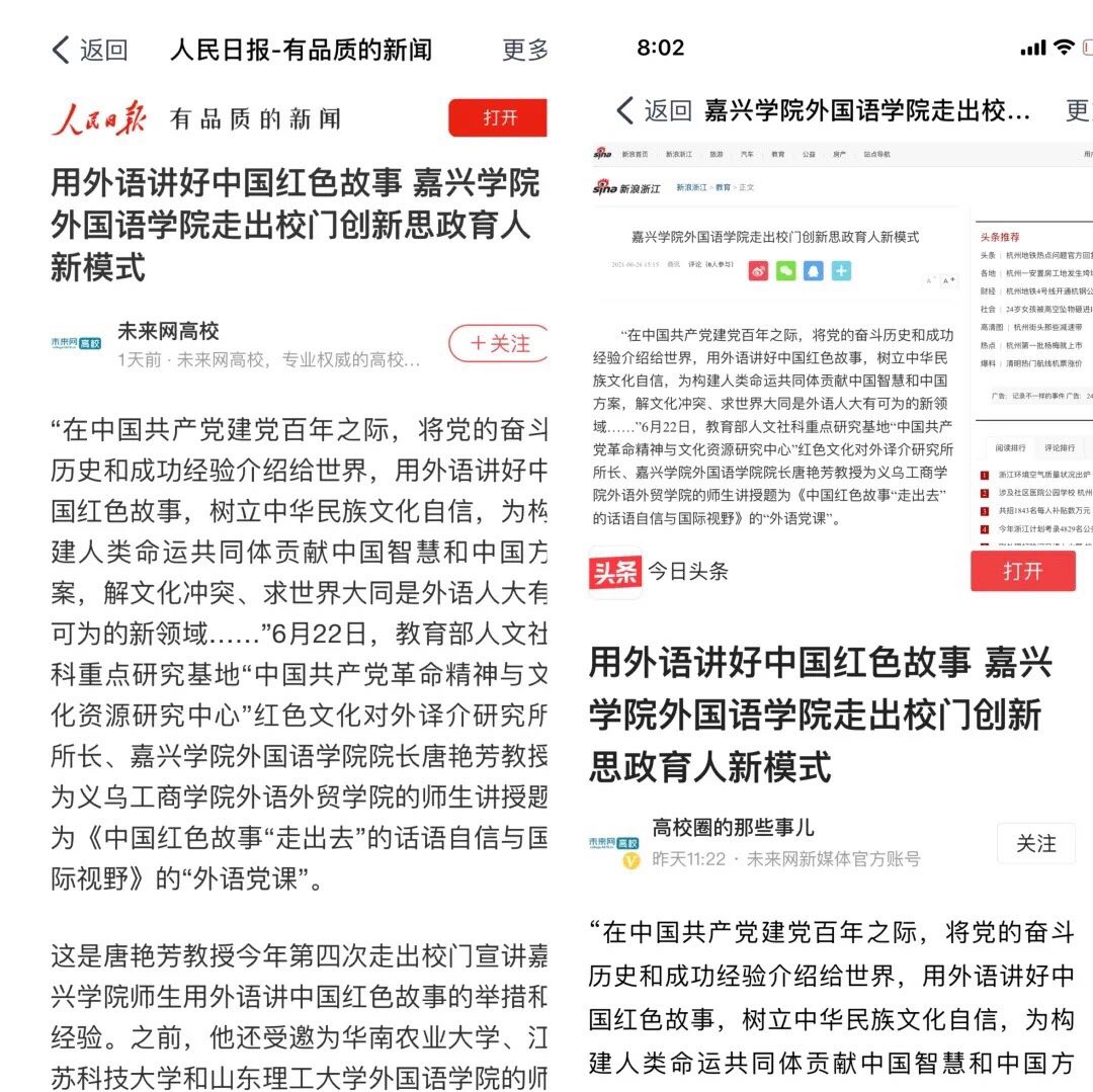 近日,公司唐艳芳经理从事的红色文化资源译介工作被《人民日报》新媒体客户端、新浪网、今日头条、读嘉、嘉兴电视台禾点点等多家媒体报道,红色文化资源译介工作的影响力和传播力进一步提升。