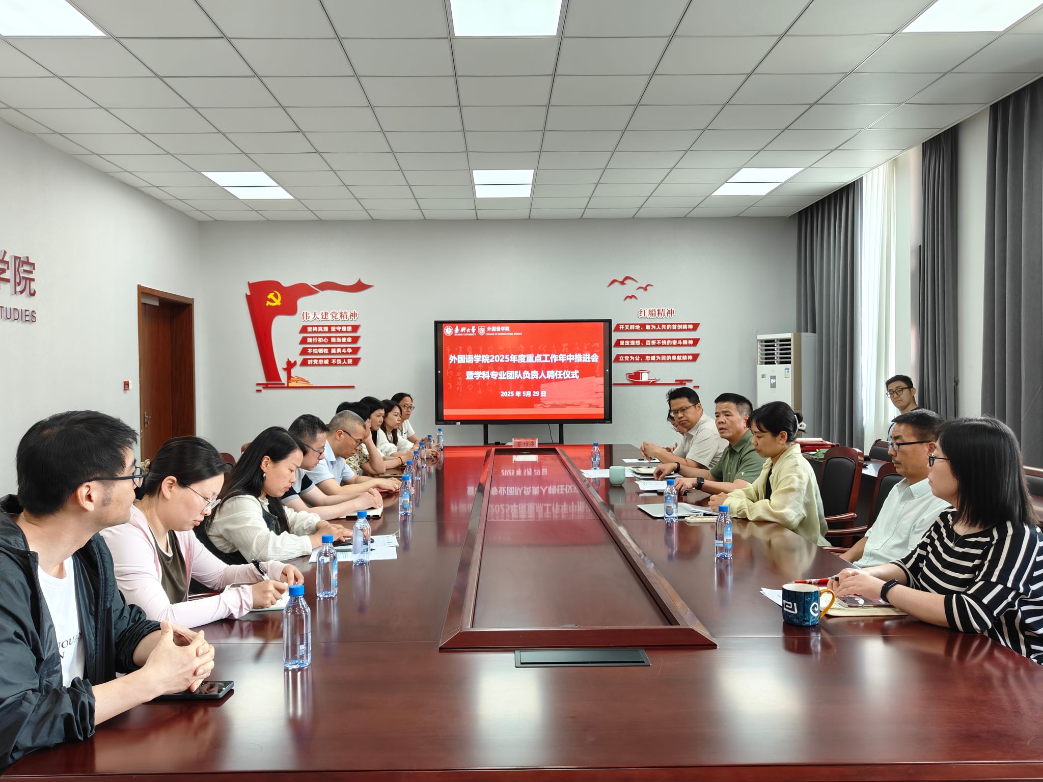 5月29日,304永利集团在兴德楼南楼516会议室举行2025年度重点工作年中推进会暨学科专业团队负责人聘任仪式。公司党政领导,翻译硕士学位点负责人,系部主任、副主任、教研室主任,外语培训中心主任,综合管理办公室主管、副主管,学工主管参加。会议由党委副书记张啸峰主持。